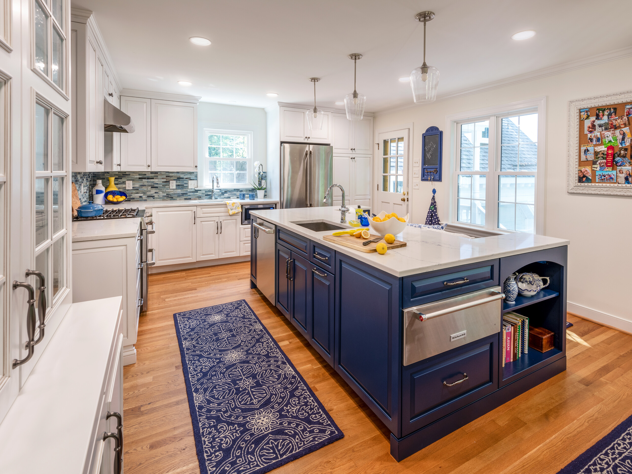 - The Focal Point: The central island is finished in Nantucket Blue, a rich, sophisticated tone that anchors the large room.
